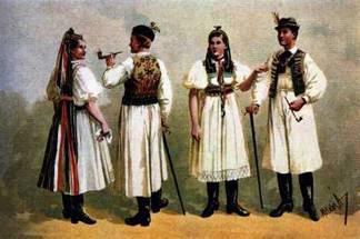 Chlapi nosili vysoké čižmy, biele nohavice vpredu vyšívané s remenným opaskom, košeľu pamutovú, ale na rukávoch a na golieri i vpredu krásne vyšívanú, potom hajštuk okolo krku na spôsob dnešnej kravaty. Čierny a vpredu červeno vyšívaný a na hlave malý klobúk, tzv. kajstrnčok, neskôr klobúk a v zime baranicu. Cez týždeň do práce chlapi nosili drelichové nohavice i košele. A k tomu ešte dlhý s peknými gombíkmi a výšivkami zdobený bahoato lajblík- vestu. V lete chlapi drelichové gate. Mládenci- parobci zase v nedeľu rancané gače pamutové a vpredu vyšívaný bohato šorc- zásteru akoby, potom pamutovú košeľu ako chlapi, lajblík, lenže zdobený rôznofarebnými pantličkami a na hlave klobúk s pierkom.
