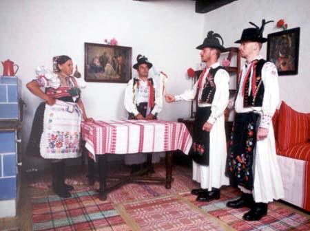 Pri svadbe hrala muzika pre mládež. Potom s mladou keď odchádzali z domova do domu mladoženícha, robila sa veľká brána s reťazami a mládenci sa preobliekli za cigánky a strigy. Počas svadby robili sa závody v behu. Kto bol prvý, dostal liter pálenky alebo rumu. Starosta mal jedličkum, na ktorej visela pálenka a pántličky a tancovalo sa so ženami- nevestami. Svatka zase upiekla velikánsky koláč a ten niesli dve, prípadne až štyri ženy na nosítkach. V dome mladoženícha boli zvláštne svadobné obrady: sviečkový tanec, družbovský a predávanie mladej. Zaujímavý bol zbojnícky tanec. Dievky niesli ladu so šatami so spevom a ženy zase periny a zahlávky od mladej ku mladému.