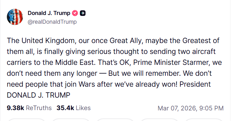 V príspevku na Truth Social Trump nazval Britániu „naším kedysi veľkým spojencom“ a varoval, že Amerika si bude pamätať na svoje zlyhanie v poskytovaní podpory v počiatočných fázach útokov.